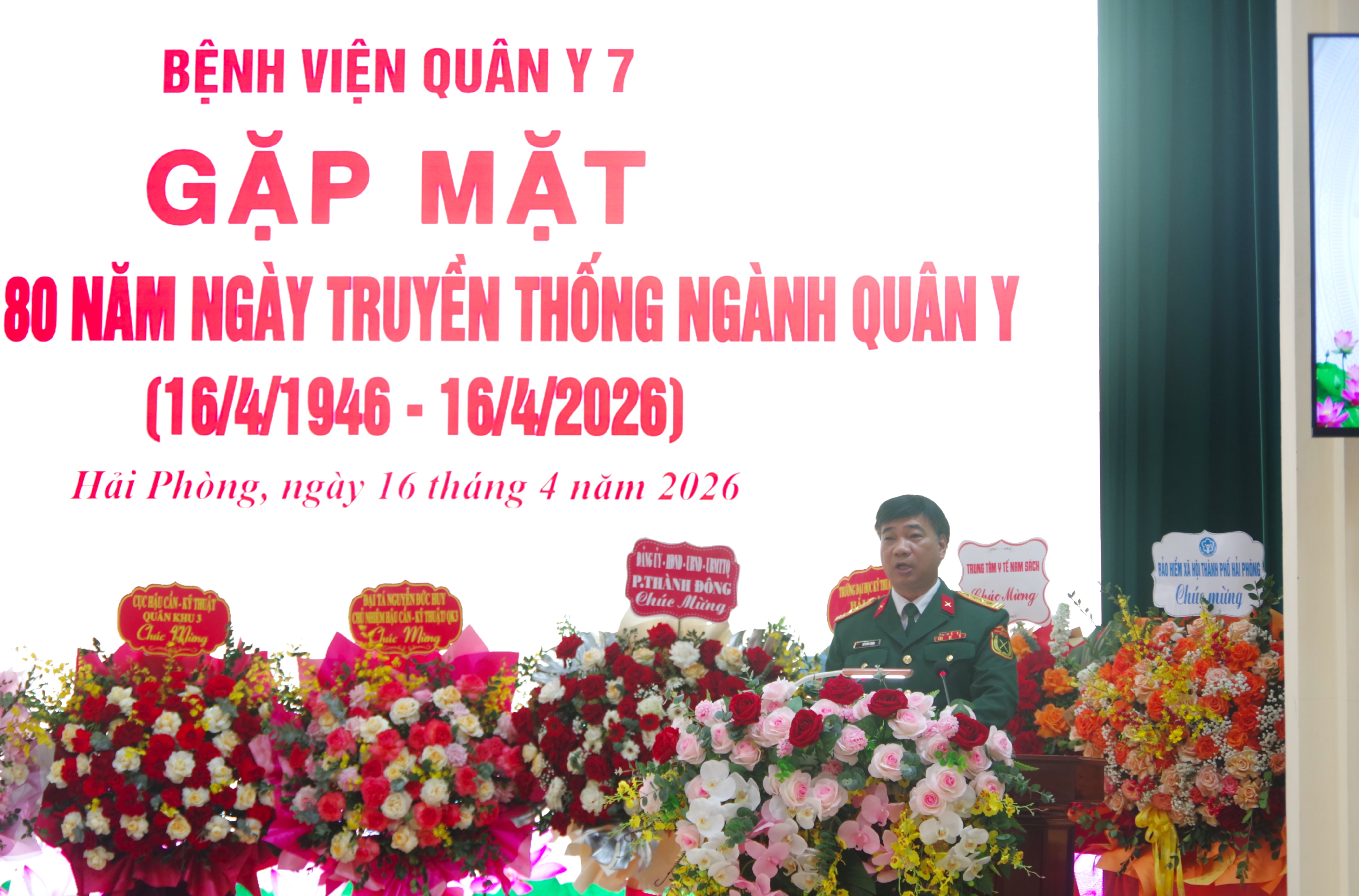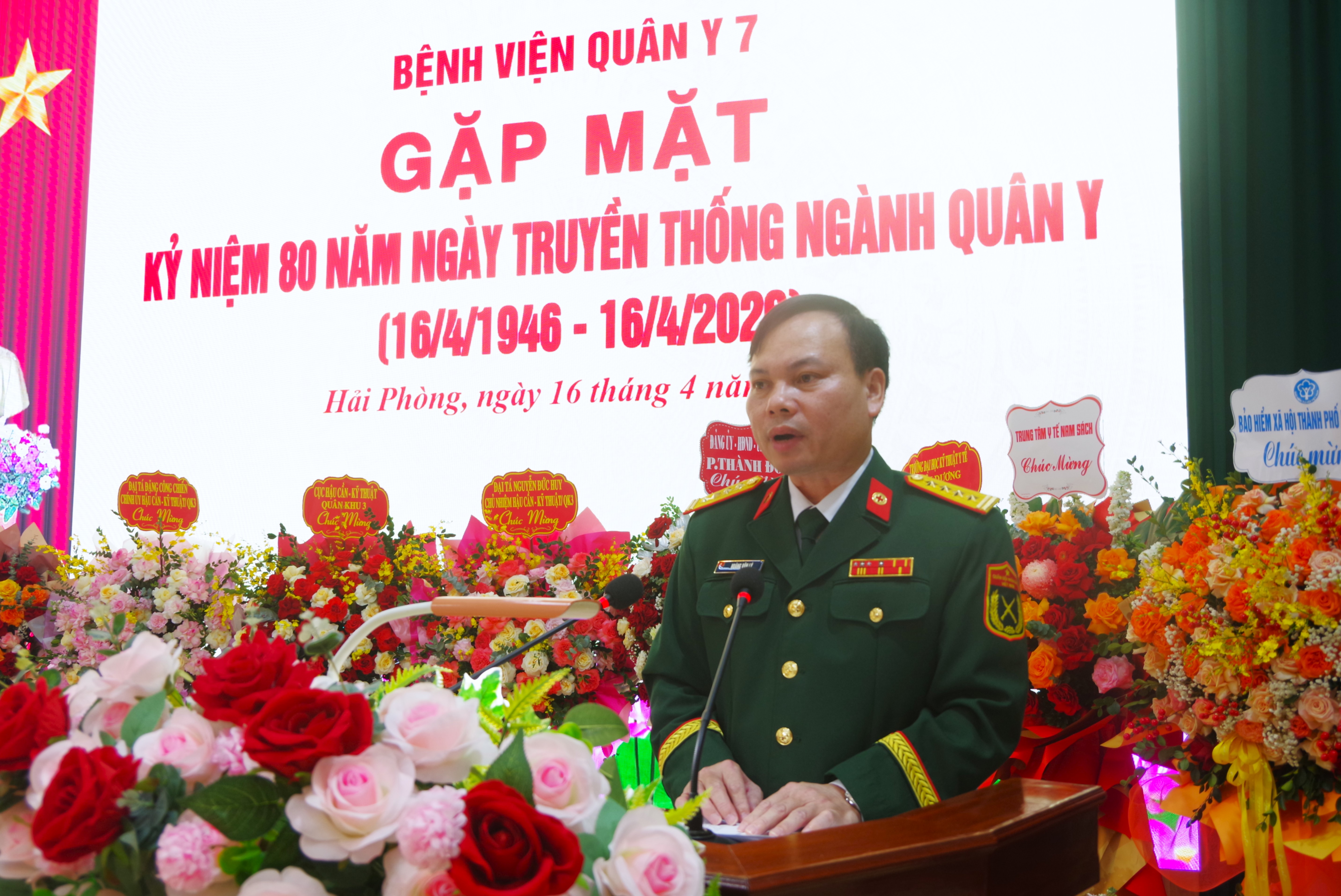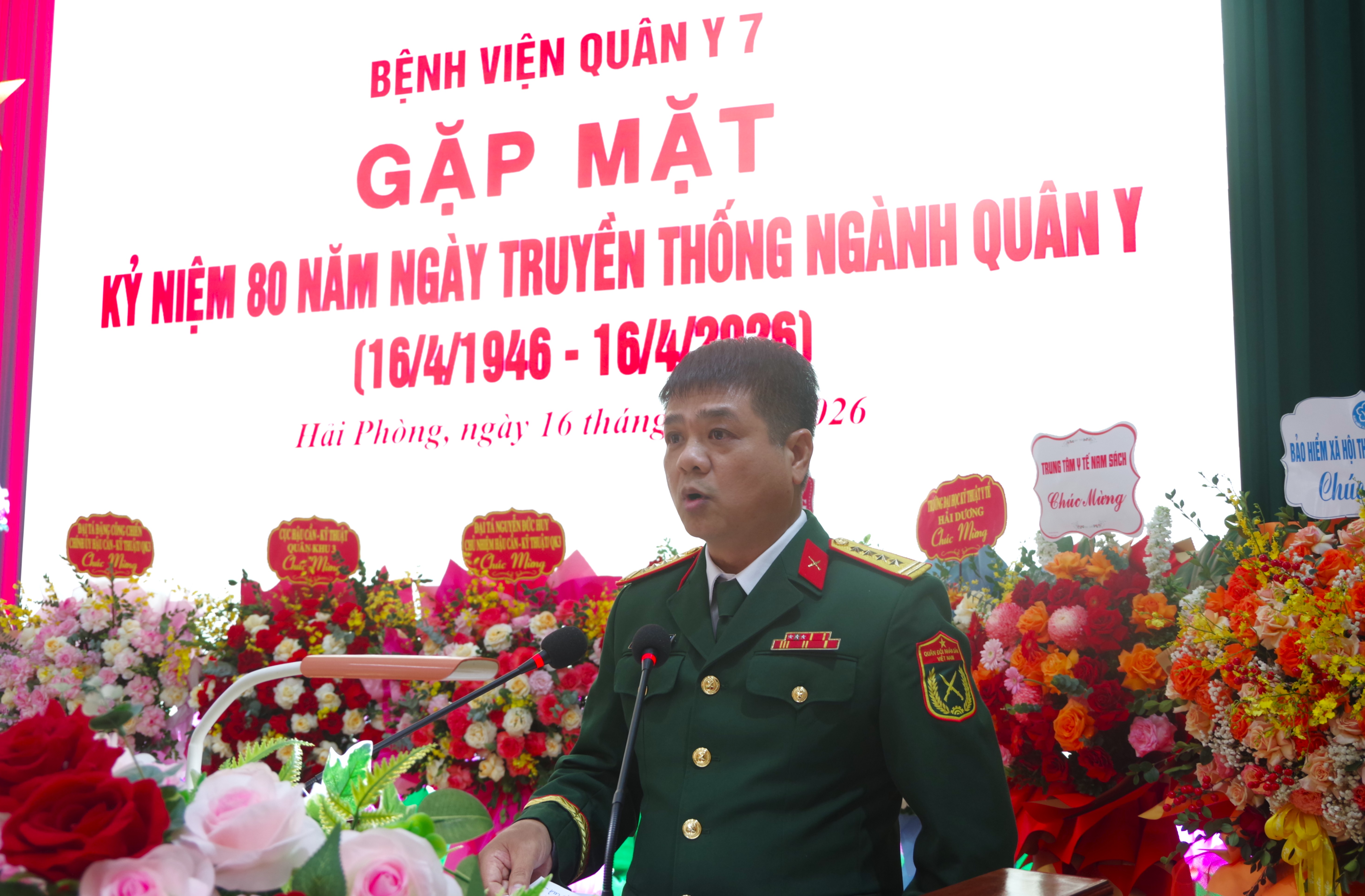Đồng chí Đại tá TTƯT Hoàng Văn Lý - Giám đốc Bệnh viện Quân y 7 trình bày diễn văn kỷ niệm 80 năm Ngày truyền thống Ngành Quân y