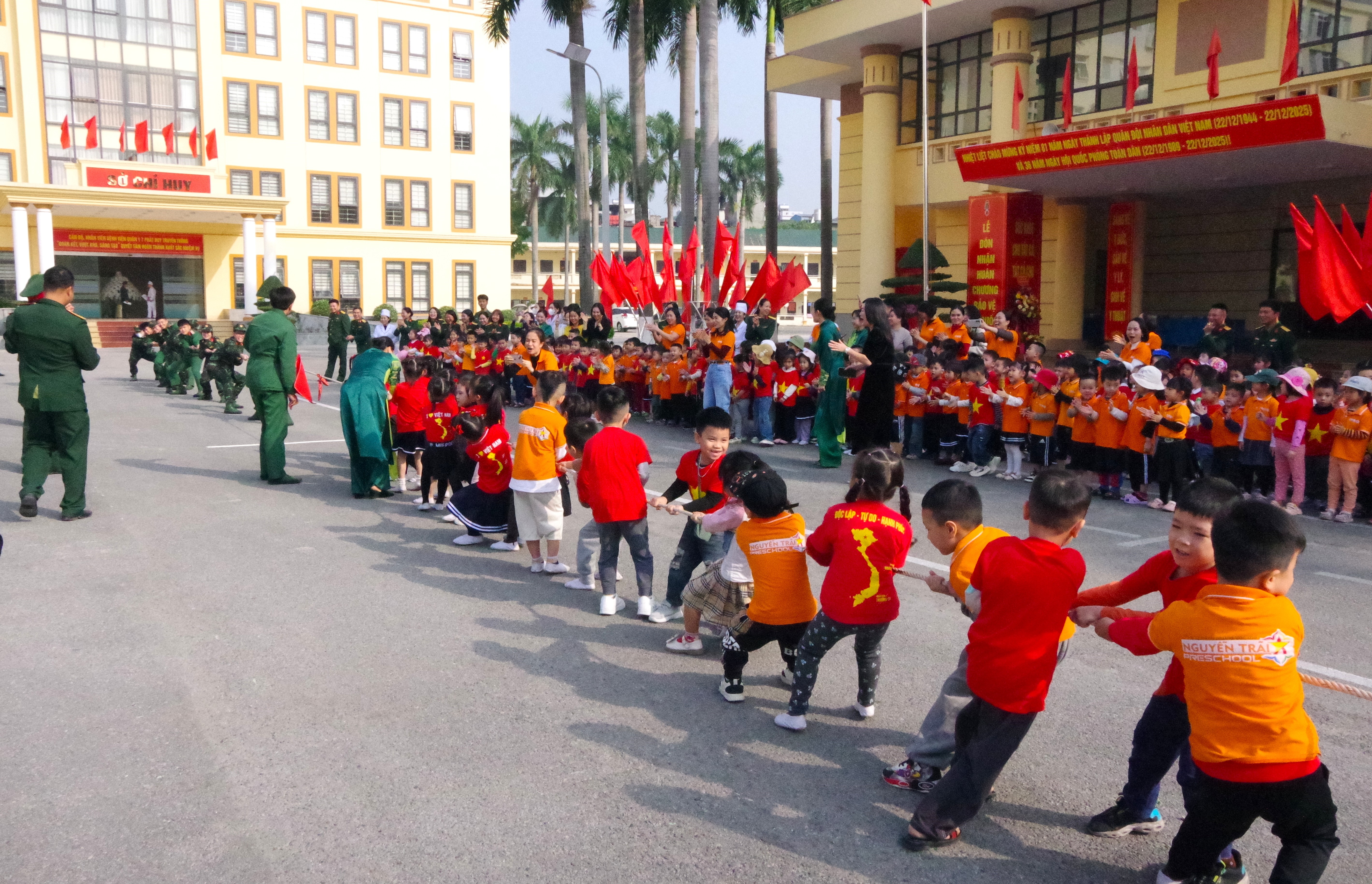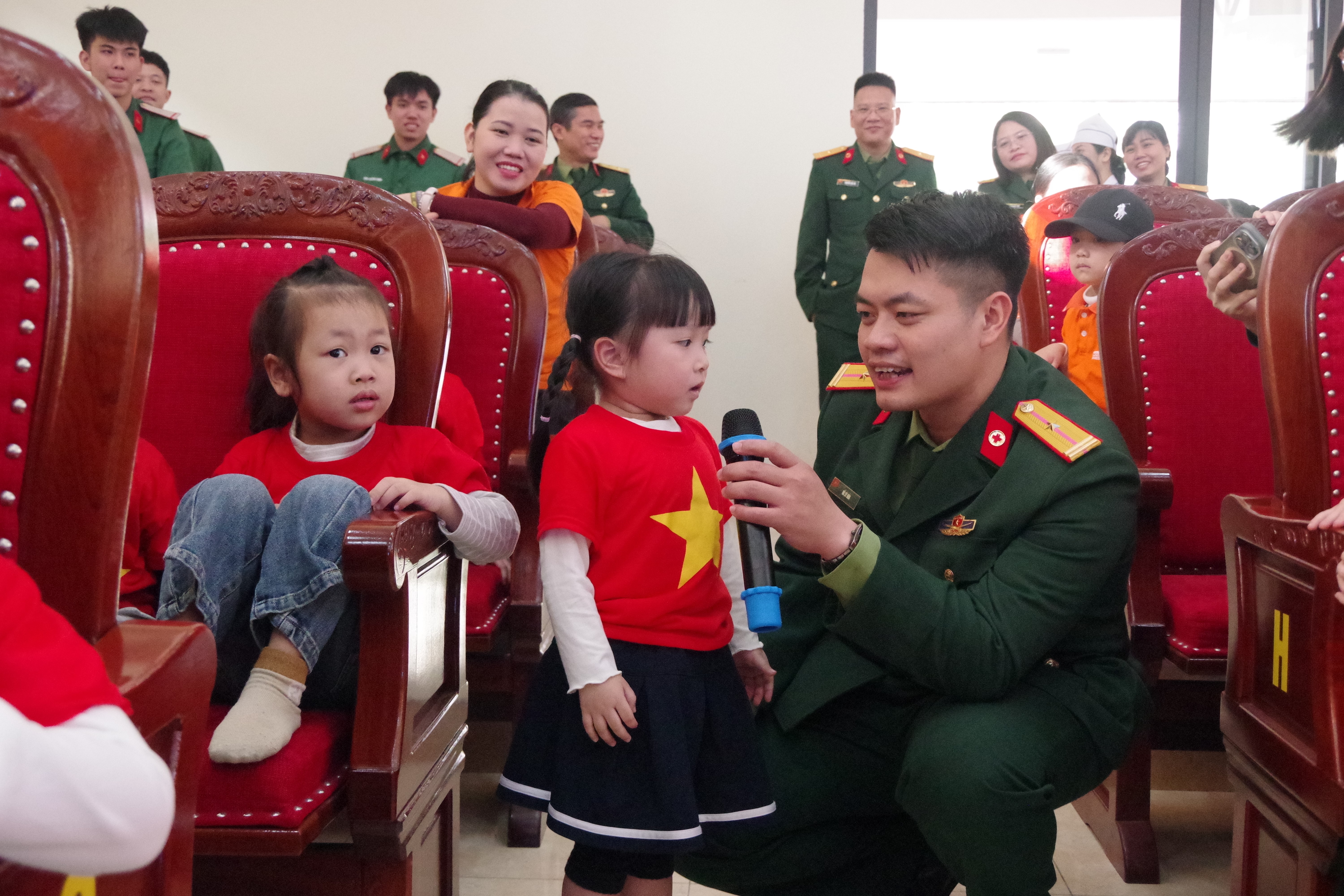 Chương trình giao lưu văn nghệ giữa cán bộ, chiến sĩ và cô trò nhà trường cũng để lại nhiều cảm xúc đẹp. Những tiết mục múa, hát ngây thơ, trong sáng của các cháu mầm non xen lẫn với các bài ca truyền thống cách mạng, ca ngợi hình ảnh Bộ đội Cụ Hồ đã góp phần lan tỏa tình yêu quê hương, đất nước. Đồng thời, các bạn nhỏ còn được tham gia các trò chơi bổ ích như hỏi đáp nhận quà; kéo co cùng các chú bộ đội cũng đã mang lại nhiều tiếng cười và niềm vui.