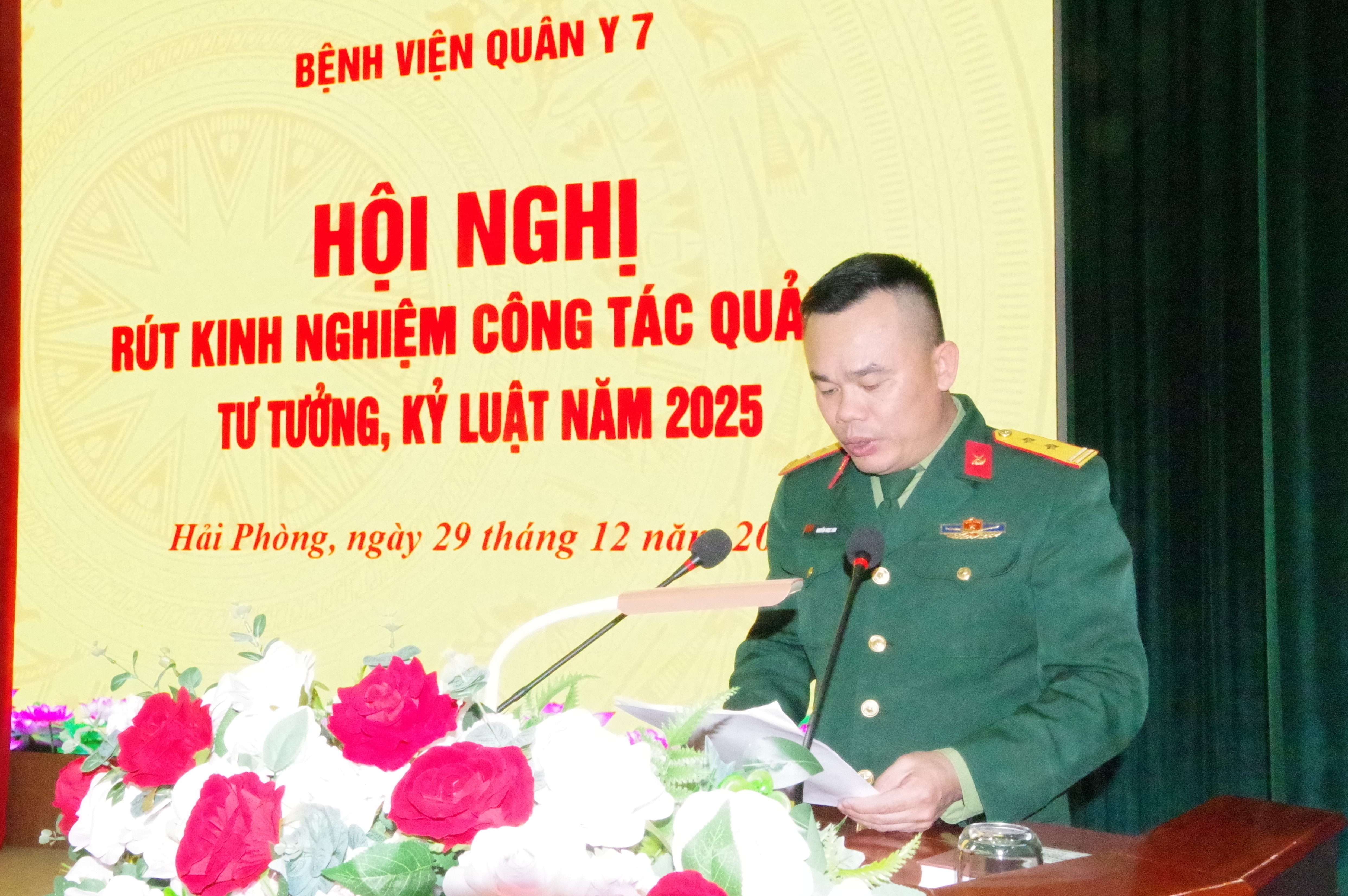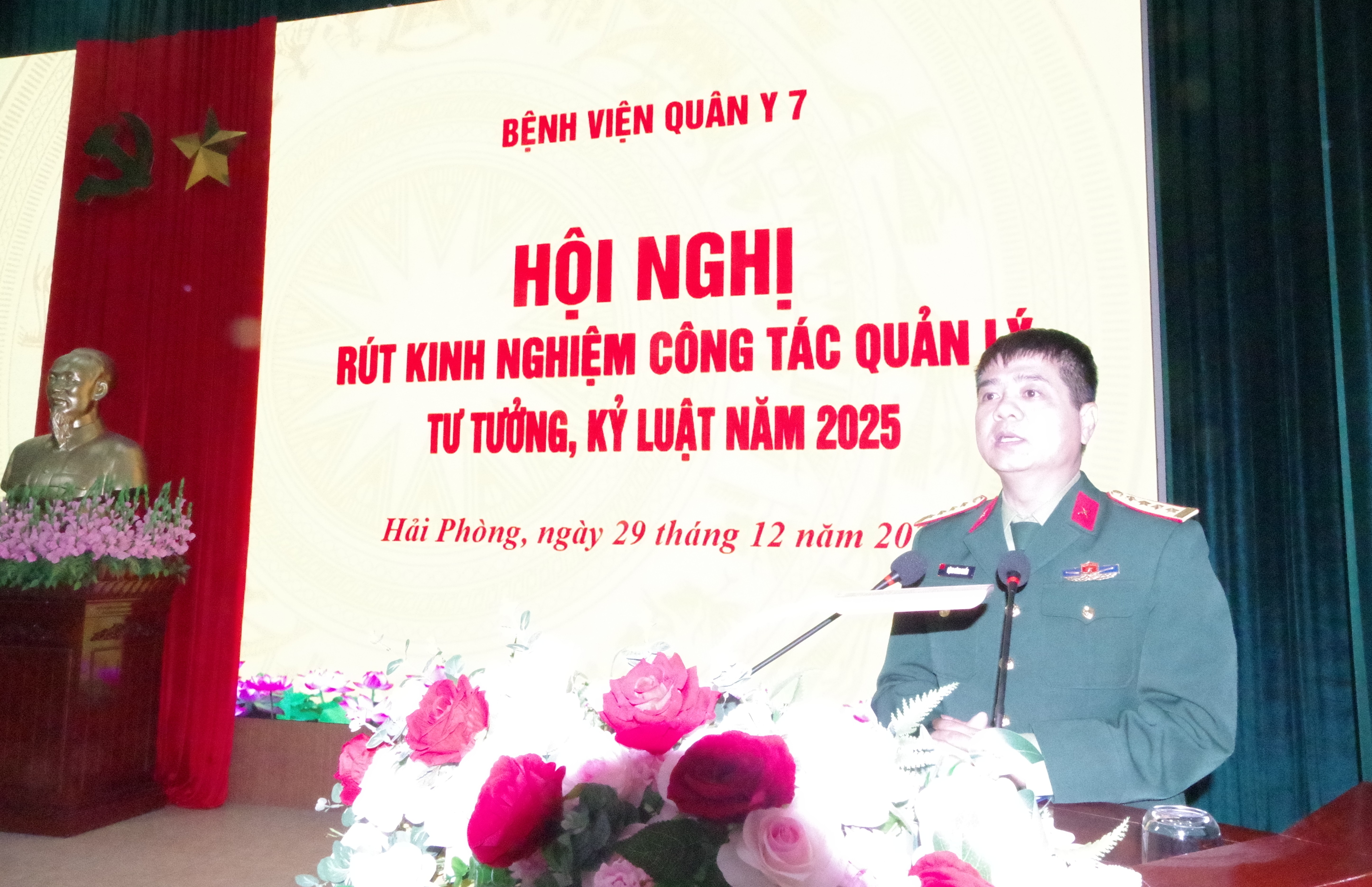 Chiều ngày 29/12/2025, Bệnh viện Quân y 7 tổ chức Hội nghị rút kinh nghiệm công tác quản lý tư tưởng, kỷ luật trong năm 2025. Hội nghị nhằm đánh giá toàn diện kết quả đạt được, chỉ rõ những hạn chế, nguyên nhân và đề ra phương hướng, giải pháp tiếp tục nâng cao hiệu quả công tác quản lý tư tưởng, kỷ luật trong thời gian tới, đáp ứng yêu cầu nhiệm vụ trong tình hình mới.