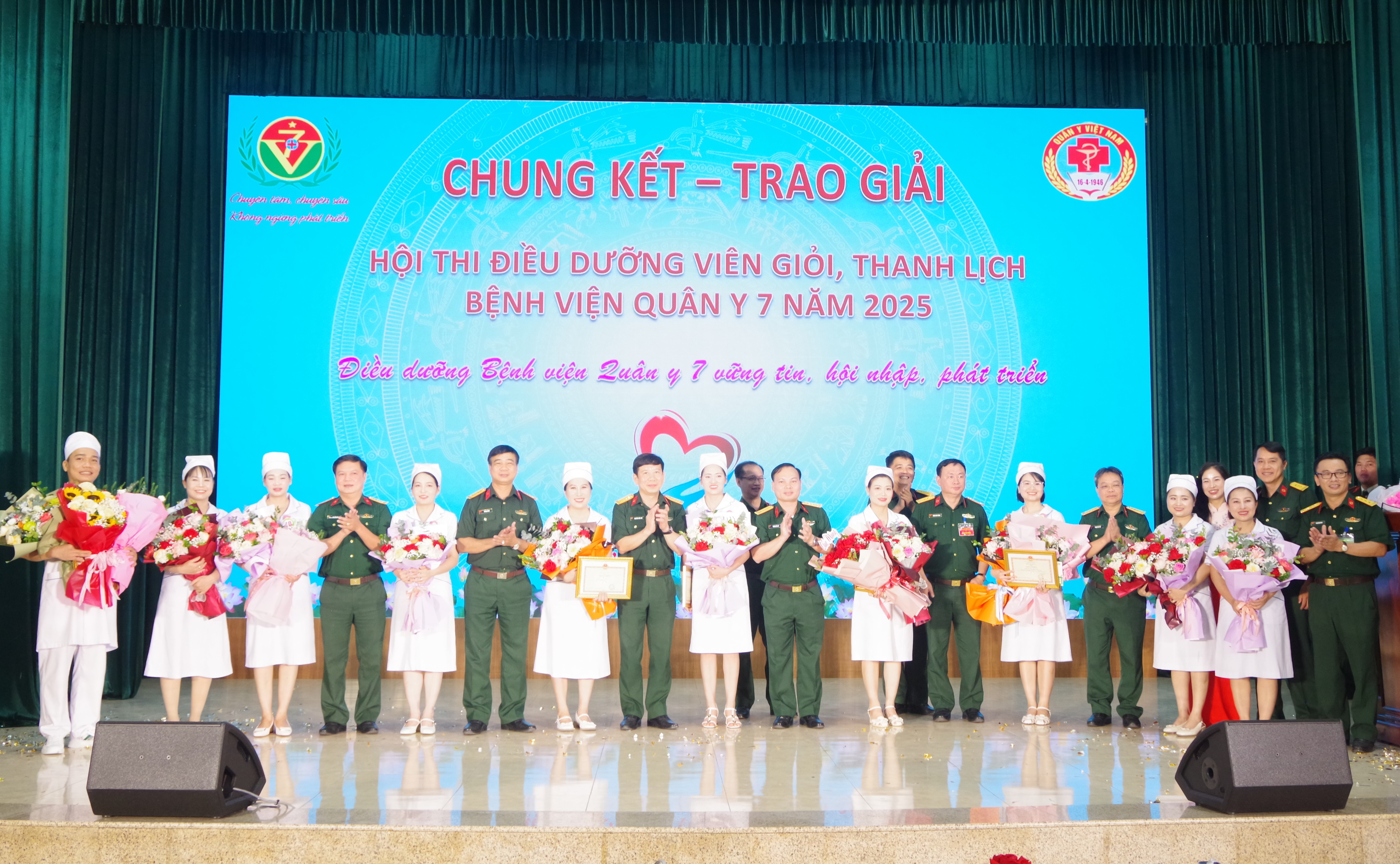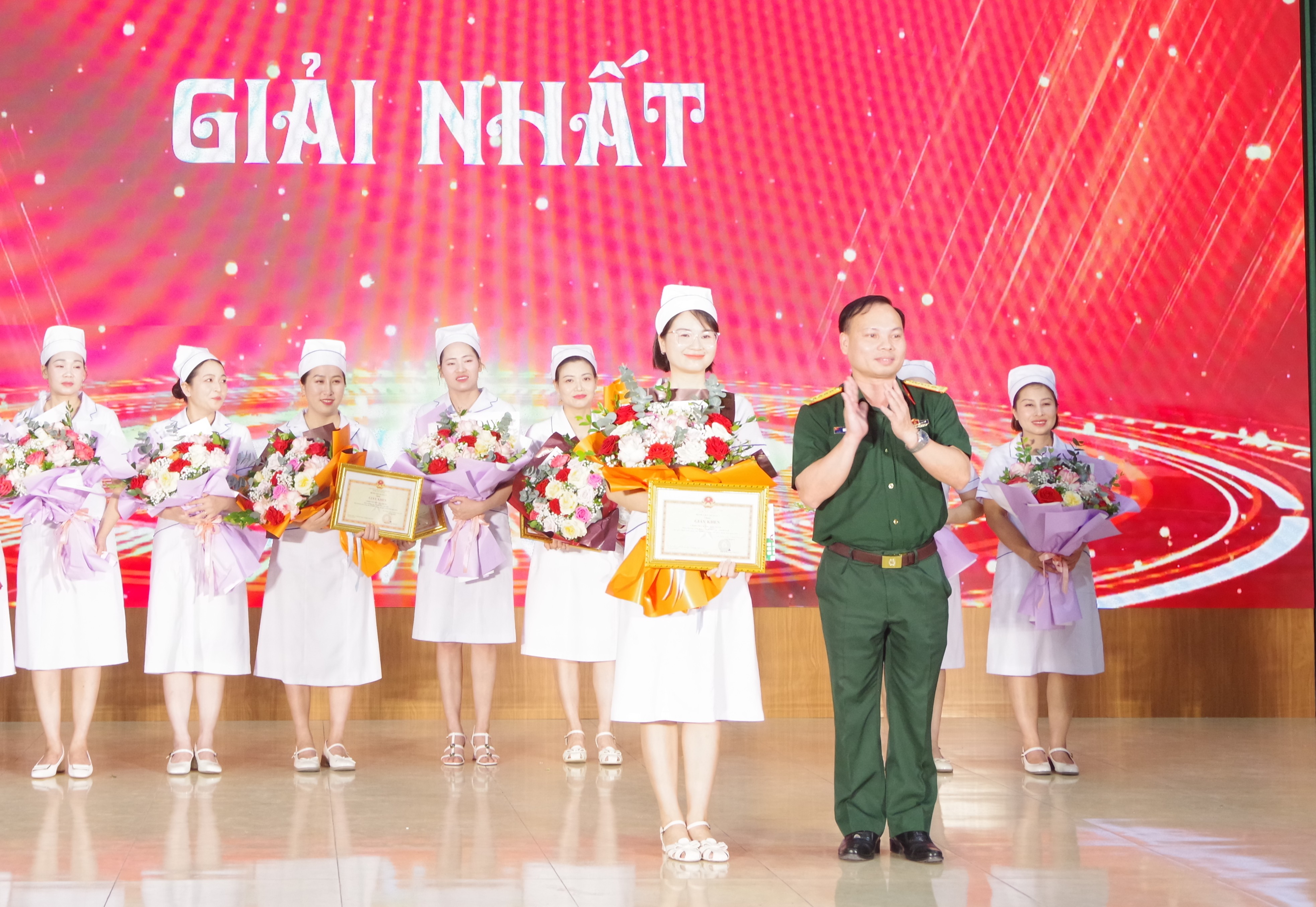Đồng chí Đại tá TTƯT Hoàng Văn Lý - Giám đốc Bệnh viện Quân y 7 trao giải Nhất toàn năng Hội thi Điều dưỡng viên giỏi, thanh lịch Bệnh viện năm 2025