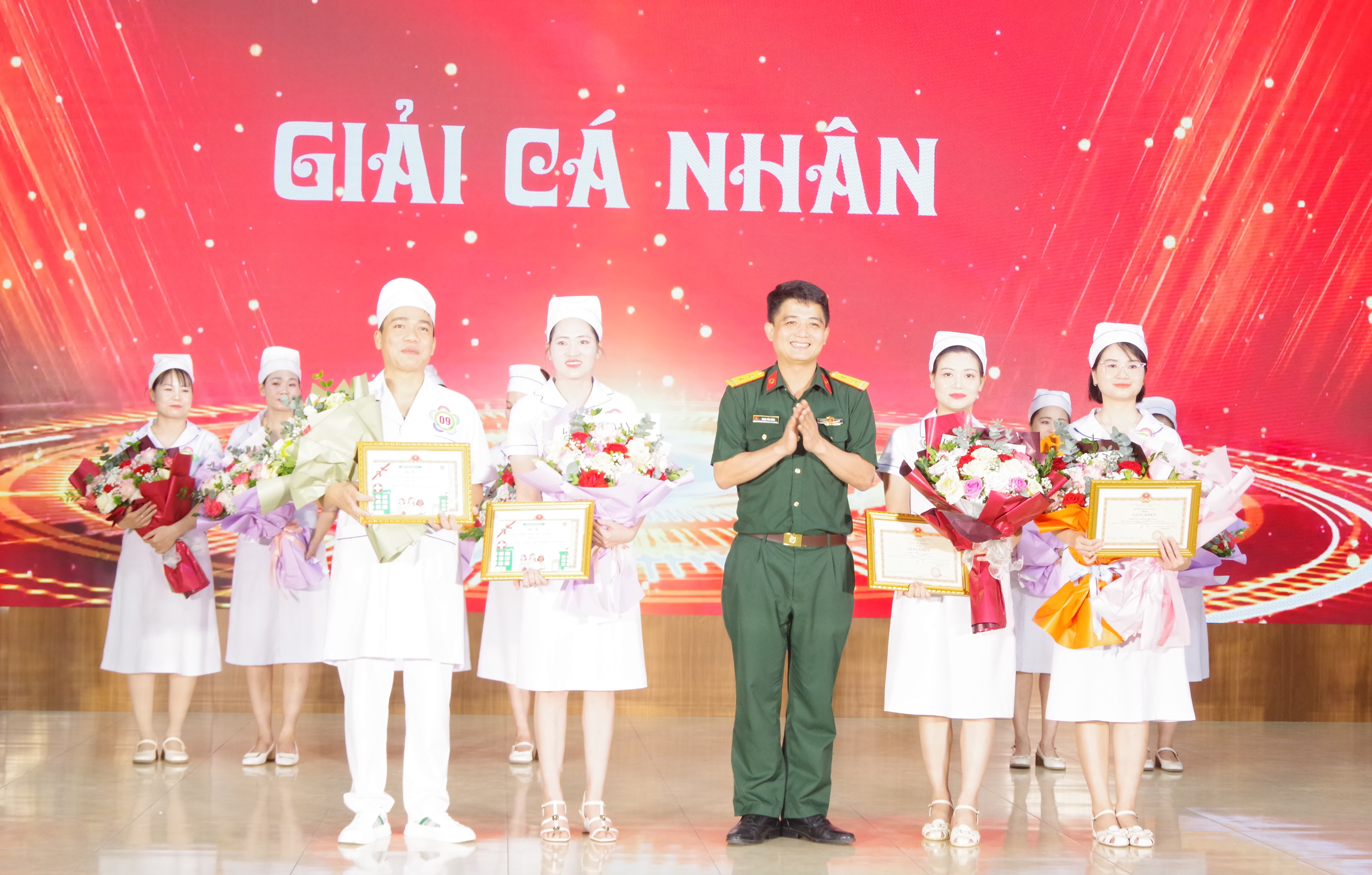 Đồng chí Trung tá Phạm Văn Dũng - Phó Giám đốc Bệnh viện Quân y 7 trao các giải phụ cá nhân Hội thi Điều dưỡng viên giỏi, thanh lịch Bệnh viện năm 2025