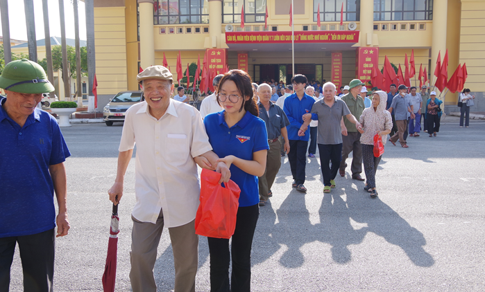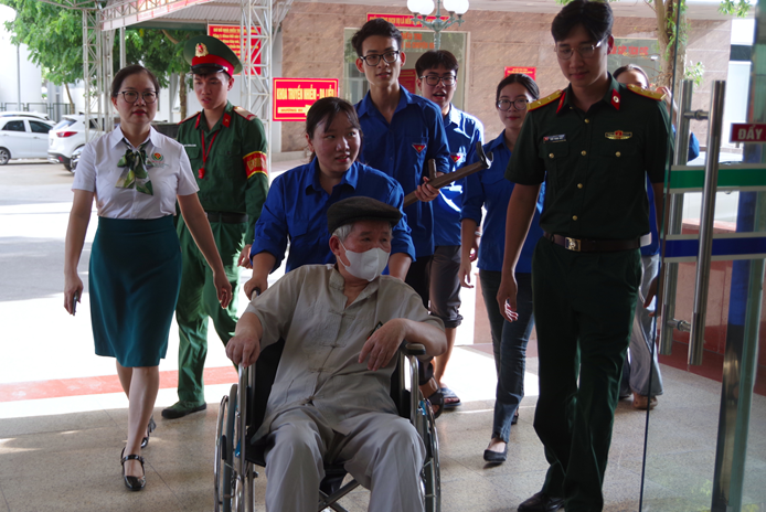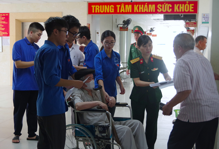 Cán bộ, nhân viên Bệnh viện Quân y 7 và đoàn viên thanh niên phường Thành Đông tích cực hỗ trợ các thương bệnh binh trong quá trình khám bệnh