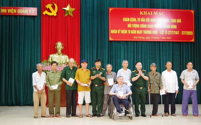 Nhân kỷ niệm 78 năm Ngày Thương binh - Liệt sỹ (27/7/1947 - 27/7/2025), sáng ngày 19/7/2025, Bệnh viện Quân y 7 (Cục Hậu cần - Kỹ thuật, Quân khu 3) phối hợp với UBND phường Thành Đông, TP. Hải Phòng tổ chức khám bệnh, tư vấn sức khỏe, cấp thuốc và tặng quà cho các đối tượng chính sách trên địa bàn.